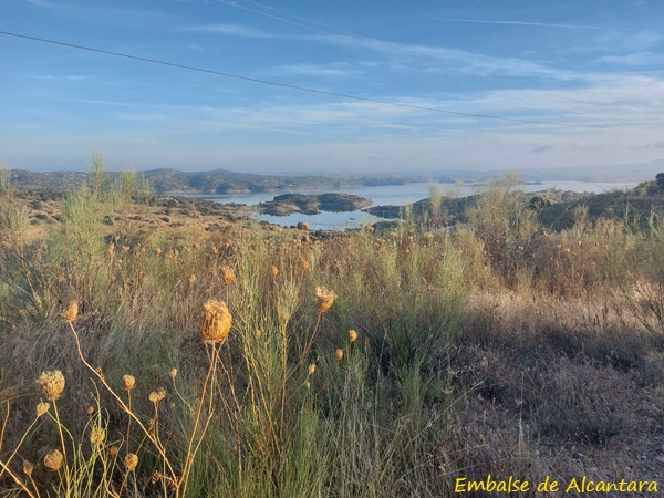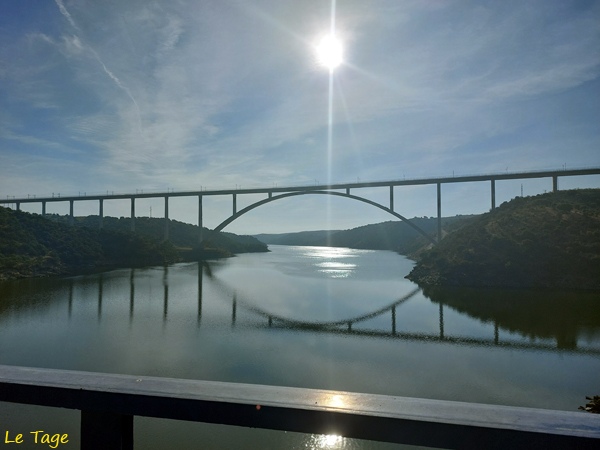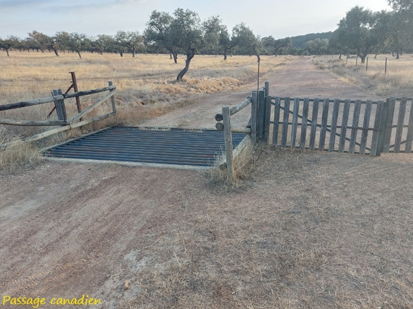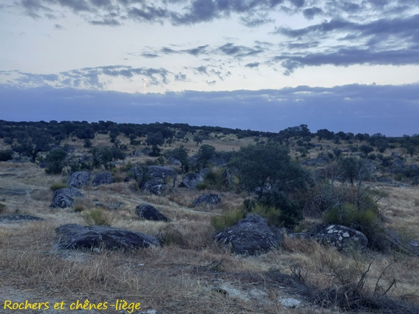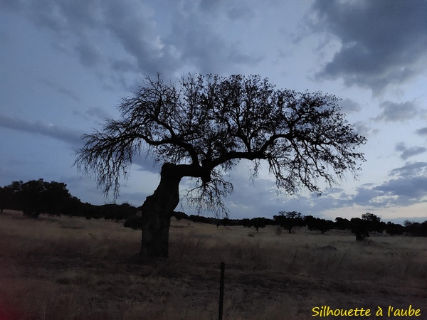 Ce matin, lever à 4h, départ à 4h30 dans les décombres de la veille. Trois heures de chemin avant le lever du soleil, nuit noire étoilée, un petit croissant de lune, une belle piste sableuse légèrement montante et après les passages canadiens les yeux fluorescents des troupeaux et les grognements rapprochés et dissuasifs des chiens gardiens de troupeaux. Dès les premières lueurs, Henri accélère tout en restant attentif. Vers 7h30, nous apercevons l’Embalse de Alcantara au loin. Le chemin devient nettement plus étroit et escarpé. À 10h30 nous avons parcouru l’étape initiale, restent encore 11 km que nous choisissons de faire par la route donc 4 km de moins que par le chemin. Mauvais choix? Tuant!!! À l’albergue turistica de Cañaveral, il y a Ricardo, un Italien de Modène qui circule à vélo depuis trois mois au gré de ses humeurs. Nous formons une belle petite équipe éphémère…