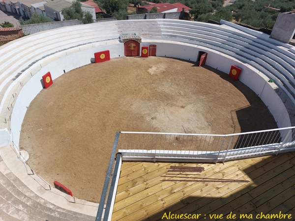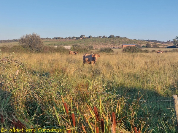 Partie ce matin à la frontale à 6h45, il fait encore nuit noire. 2 km de route pour quitter Aljucen puis un long chemin sableux , empierré et relativement plat, sauf vers la fin, m’a emmenée jusqu’à Alcuescar. Personne si ce n’est 3 vaches (?) noires aux belles cornes… au moment où je voulais faire une pause (pas faite!). La Via n’est qu’une succession sur 18 km de passages canadiens séparant les propriétés agricoles entre elles. Un peu flippant par moment. Paysages secs, pierres et chênes-liège cèdent peu à peu la place à une végétation plus verdoyante. Moutons, chèvres quelques aboiements…. Une variante me fait arriver à l’albergue à 12h45. Là c’est le choc, c’est l’arène du village qui est transformée. C’est neuf, clair et très spacieux.
