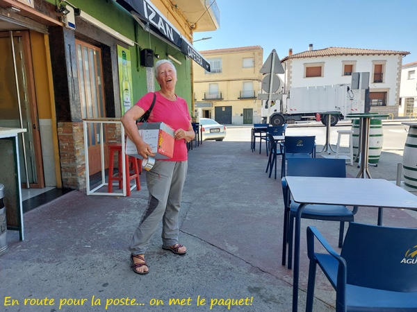 Une mini-étape entièrement sur route mais dans un environnement vert et parfois des arrosages automatiques de champs de maïs. Quelques belles vaches et la chance de cheminer à deux pour casser la monotonie du plat. Arrivée vers 10h à Carcaboso, auberge ouverte mais déserte. Nous nous sommes installés et j’ai décidé de renvoyer ma tente: rassemblement des différentes pièces dispersées dans le sac pour une meilleure répartition du poids, fabrication d’un emballage et direction La Poste. Pas simple car il s’agit d’une antenne installée à la mairie et gérée par une factrice tournante de 13h30 à 14h.