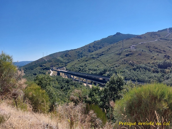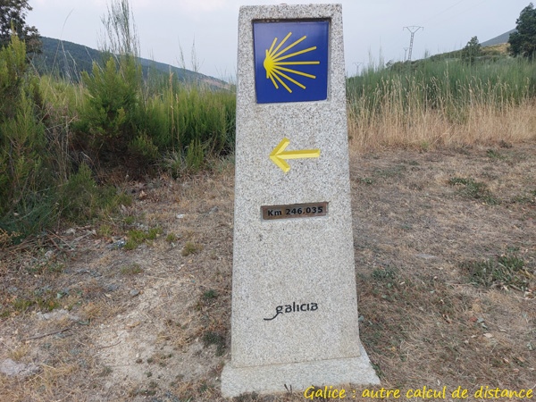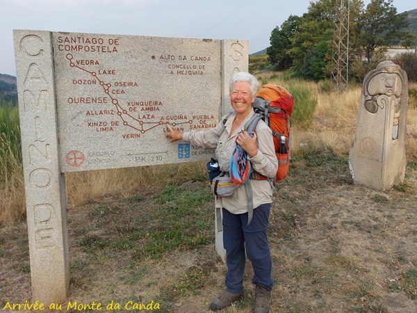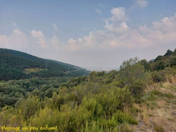 Passage en Galice à l’Alto da Canda (1172m). En Galice, le calcul des distances vers Santiago change aussi et on ne sait pas expliquer pourquoi. Du coup, on recule de presque 40km. À l’Alto da Canda, le panorama est voilé par les fumées résultant des grands incendies qui ravagent le Portugal et le nord-Leon depuis 3 ou 4 jours.