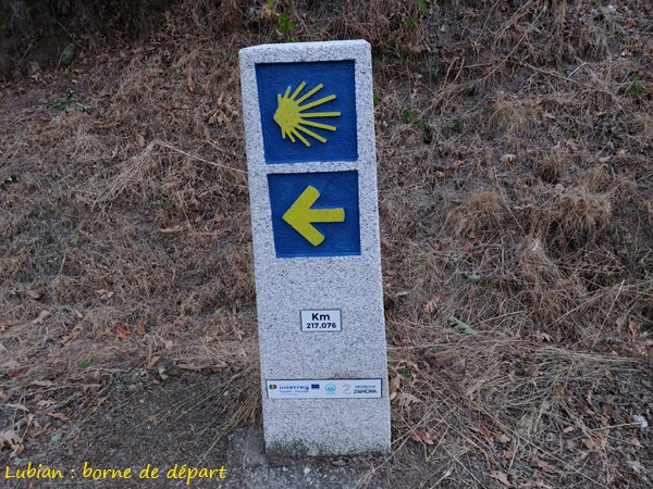 Aujourd’hui montée jusqu’à 1345m, alors je prends un bon petit-déjeuner à l’hôtel. Départ à 9h. La sortie de Puebla est assez champêtre à part une gravière en activité. Un peu de bitume mais dans l’ensemble c’est assez agréable. Beaucoup d’eau, des bois de châtaigniers, deux passages dans des pâtures avec vaches carillonnantes. La montée au col se fait sans grande difficulté excepté deux tronçons de voie bétonnée assez raides. Je pensais m’arrêter à l’hôtel de Padornelo, juste après le col mais j’ai été déçue: station-service coincée entre nationale et autoroute, camions vrombissants. J’ai donc décidé de continuer mon chemin jusqu’à l’étape proposée par le guide. À Lubian, où on accède par un sentier parfois ruisseau en forte descente, il y a une petite albergue avec déjà un pèlerin: Miguel. C’est son 2ème jour, il vient de Vigo, pas très loin d’ici et espère aller à Santiago. Ce soir, on va prendre un menu del dia ensemble…